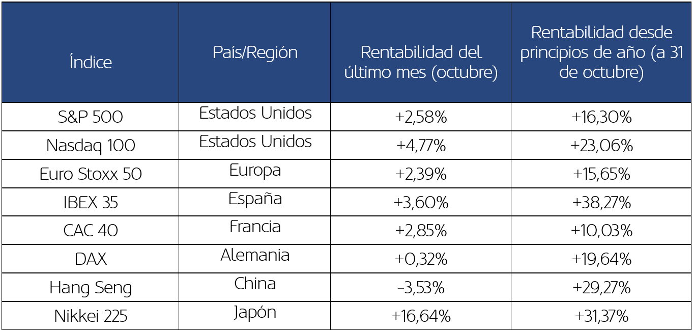 El mes de octubre estuvo marcado por la incertidumbre política en Estados Unidos y en Europa -con el cierre parcial del gobierno estadounidense y la crisis presupuestaria en Francia en el foco-, la escalada inicial y la posterior rebaja de tensiones comerciales entre EE. UU. y China, y el ajuste de las expectativas de política monetaria. En este contexto, la Reserva Federal rebajó el tipo oficial en 25 puntos básicos, situándolo en el rango del 3,75%-4,00%, aunque el presidente Powell enfrió la posibilidad de un nuevo recorte en diciembre. Sin embargo, el mercado laboral estadounidense sigue mostrando señales de moderación y la inflación se mantiene en niveles elevados. En Europa, el BCE mantuvo los tipos de interés inalterados, mientras que los indicadores de actividad mostraron fortaleza con una lectura del PIB por encima de lo esperado y un IPC contenido cercano al 2%. En Asia, el Banco de Japón mantuvo el precio del dinero sin cambios, mientras que el relevo político situó a Sanae Takaichi como nueva primera ministra, con una agenda centrada en la política fiscal proactiva y la inversión en tecnología y defensa.
