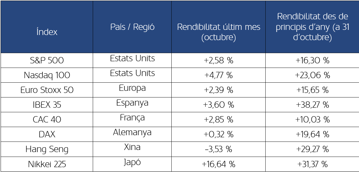 El mes d’octubre va estar marcat per la incertesa política als Estats Units i a Europa —amb el tancament parcial del govern nord-americà i la crisi pressupostària a França en el focus—, l’escalada inicial i la posterior rebaixa de tensions comercials entre els EUA i la Xina, i l’ajust de les expectatives de política monetària. En aquest context, la Reserva Federal va rebaixar el tipus oficial en 25 punts bàsics, situant-lo en el rang del 3,75 %-4,00 %, tot i que el president Powell va refredar la possibilitat d'una nova retallada al desembre. Tot i això, el mercat laboral nord-americà continua mostrant senyals de moderació i la inflació es manté en nivells elevats. A Europa, el BCE va mantenir els tipus d’interès inalterats, mentre que els indicadors d’activitat van mostrar fortalesa amb una lectura del PIB per sobre de l’esperat i un IPC contingut, proper al 2 %. A Àsia, el Banc del Japó va mantenir el preu del diner sense canvis, mentre que el relleu polític va situar Sanae Takaichi com a nova primera ministra, amb una agenda centrada en la política fiscal proactiva i la inversió en tecnologia i defensa.